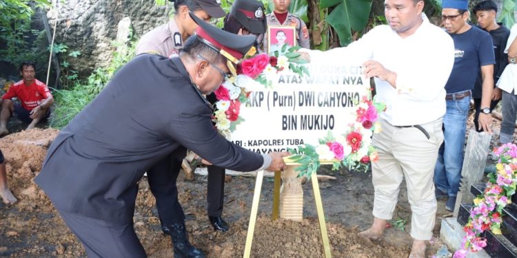 Tuba,-Polres Tulang Bawang, Polda Lampung, menggelar upacara pemakaman secara kedinasan untuk almarhum Ajun Komisaris Polisi (AKP) Purnawirawan Dwi Cahyono, yang berlangsung di tempat pemakaman umum (TPU), Kampung Dwi Warga Tunggal Jaya, Kecamatan Banjar Agung, Kabupaten Tulang Bawang, Selasa (16/01/2024), pukul 14.00 WIB s/d selesai.