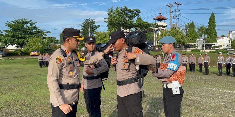 Selain memberikan pembekalan terkait tugas pengamanan pemilu, dalam kesempatan ini juga Kapolres AKBP Teddy membagikan sarpas perlengkapan pendukung kepada masing-masing petugas. Perlengkapan ini termasuk tas, rolling bed, dan handuk, baju kaos, kaos kaki yang akan membantu anggota dalam menjalankan tugas di lampangan.