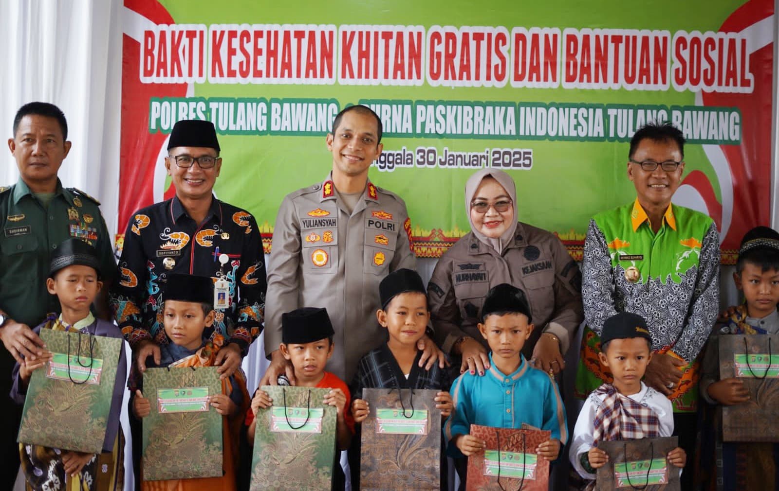 Tuba,-Polres Tulang Bawang, Polda Lampung, berkolaborasi dengan Purna Paskibraka Indonesia (PPI) Tulang Bawang menggelar kegiatan bakti kesehatan berupa khitanan massal gratis dan pembagian bantuan sosial (bansos) kepada masyarakat tidak mampu yang ada di wilayah hukumnya.