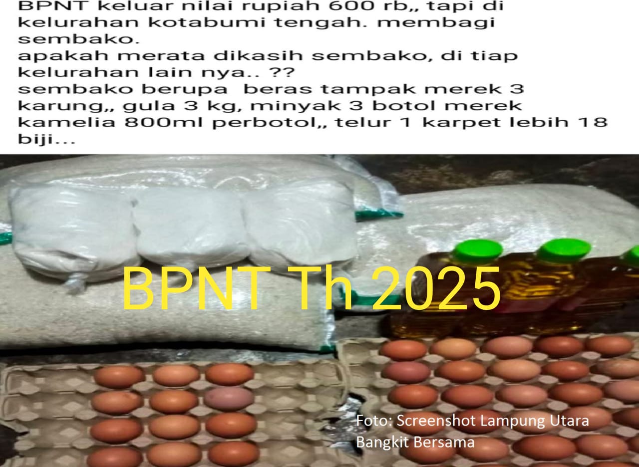 Lampung Utara – Bantuan Pangan Non Tunai (BPNT) di kabuaten Lampung Utara di keluhkan warga. Dimana nilai sembako yang di berikan ke warga lewat kelurahan melalui pihak terkait dinilai tidak sepadan. Selasa (17/06/2025).