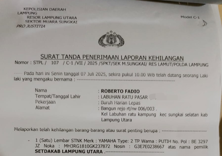 Sementara, kehilangan suran kendaraan ini telah di laporkan ke kantor polisi setempat, dengan tanda laporan pada kepolisian Nomor STPL /107/ C-I / VII/2005/ /SPKT/SEK. M. SUNGKAI/RES LAMUT/POLDA LAMPUNG.