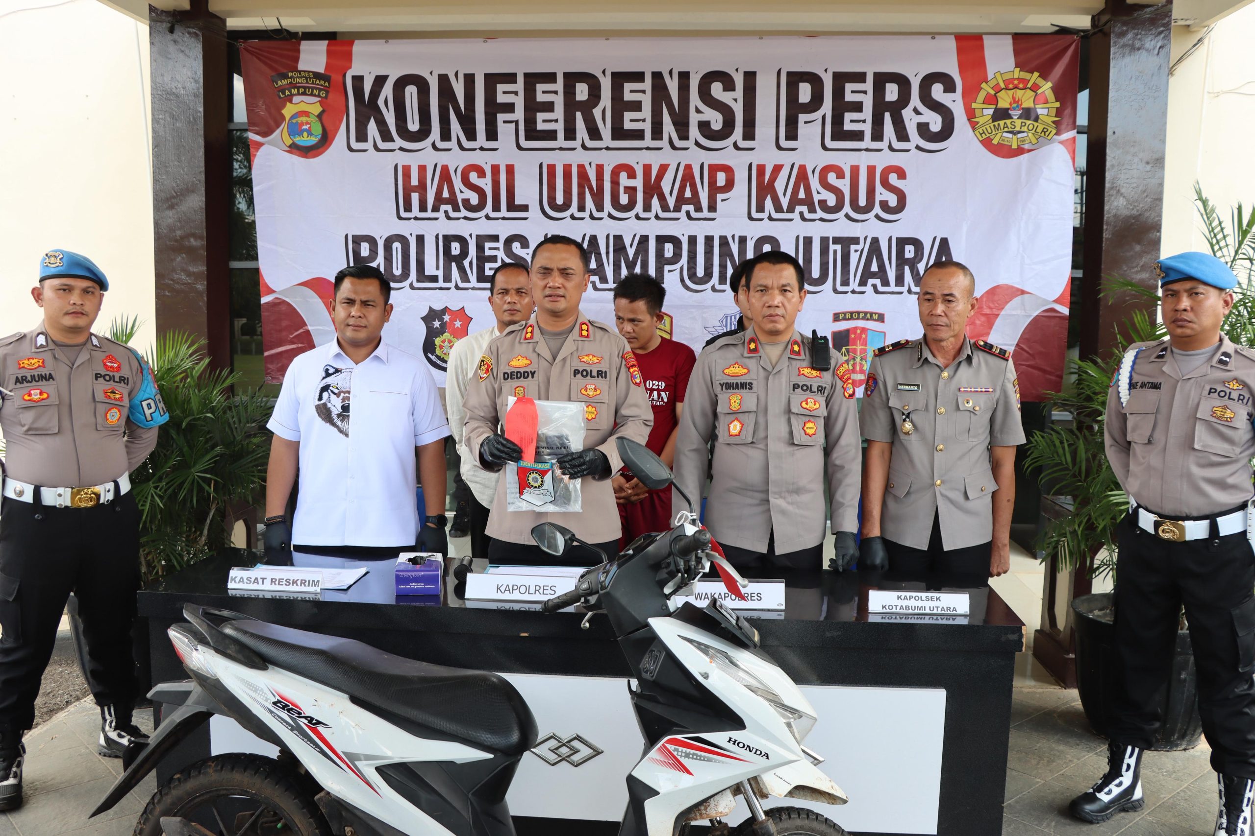 “Alhamdulillah kurang dari dua jam setelah korban ditemukan, tim Tekab 308 Polres Lampung Utara berhasil mengamankan pelaku,” kata Kapolres AKBP Deddy saat menggelar Konferensi Pers didampingi Waka Polres Kompol Yohanis, Kasat Reskrim AKP Apfryyadi dan Kapolsek Kotabumi Utara Iptu Hermanto, Jumat (22/8/2025).