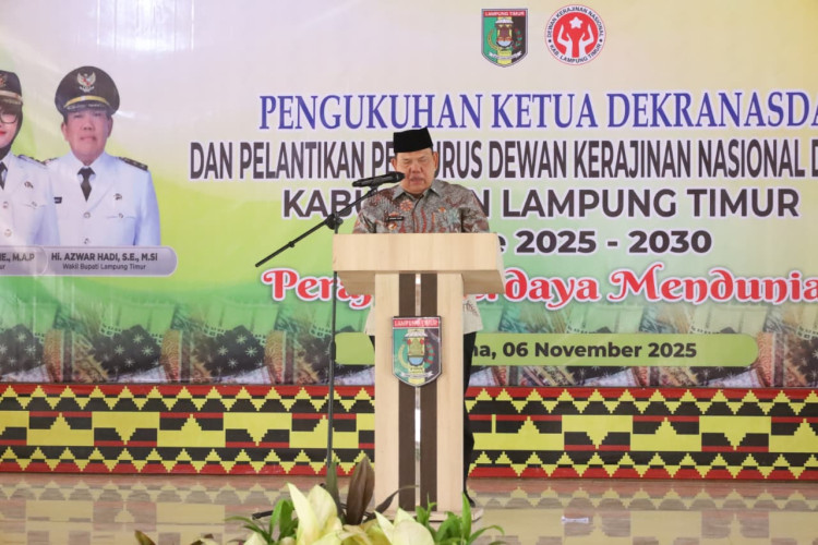 Lampung Timur – Wakil Bupati Lampung Timur, Azwar Hadi, melantik pengurus Dewan Kerajinan Nasional Daerah (Dekranasda) Kabupaten Lampung Timur dalam acara yang berlangsung di Aula Rumah Dinas Bupati Lampung Timur, Kamis (6/11/2025).