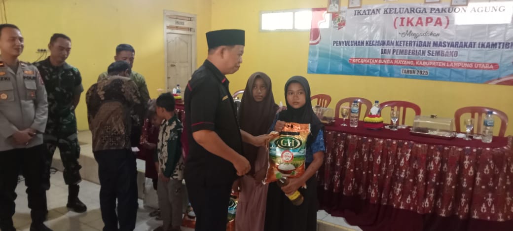 Lampung Utara, – Kembali Ikatan Keluarga Pakuon Agung (IKAPA) menggelar kegiatan Penyuluhan Keamanan dan Ketertiban Masyarakat (Kamtibmas) serta pembagian sembako di Desa Isorejo 1,Kecamatan Bunga mayang.Kegiatan sosial tersebut berlangsung penuh semangat dan mendapat sambutan positif dari masyarakat setempat Kamis (13/11/2025)