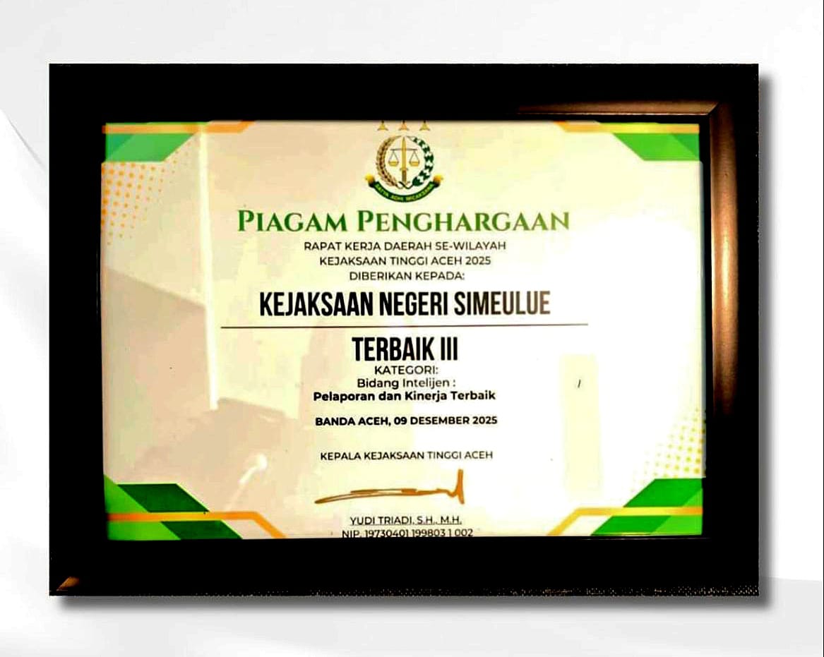 Simeulue,-Kejaksaan Negeri Simeulue kembali menorehkan prestasi membanggakan. Pada tahun 2025, Bidang Intelijen Kejaksaan Negeri Simeulue berhasil meraih Penghargaan Terbaik III dalam kategori Pelaporan dan Kinerja Terbaik Bidang Intelijen tingkat Kejaksaan Tinggi Aceh.