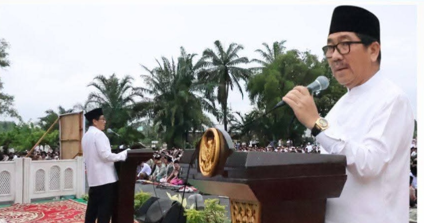 Lampung Utara– Pemerintah Kabupaten Lampung Utara menggelar Sholat Idul Fitri 1447 Hijriah di Lapangan Parkir Stadion Sukung Kotabumi, Kotabumi Sabtu 22 Maret 2026. Momentum hari kemenangan ini berlangsung khidmat dan penuh kebersamaan dengan dihadiri langsung Bupati Lampung Utara Dr. Ir. Hamartoni Ahadis, M.Si., bersama jajaran Pemerintah Daerah.