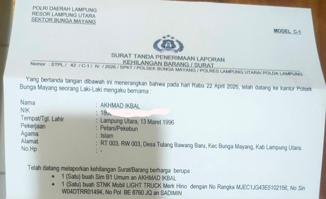 Kehilangan suran kendaraan ini telah di laporkan ke kantor polisi setempat, dengan nomor laporan, Nomor STPL / 42 / C-1 / 42 / SPKT / Polsek Bunga Mayang / Polres Lampung Utara / Polda Lampung.